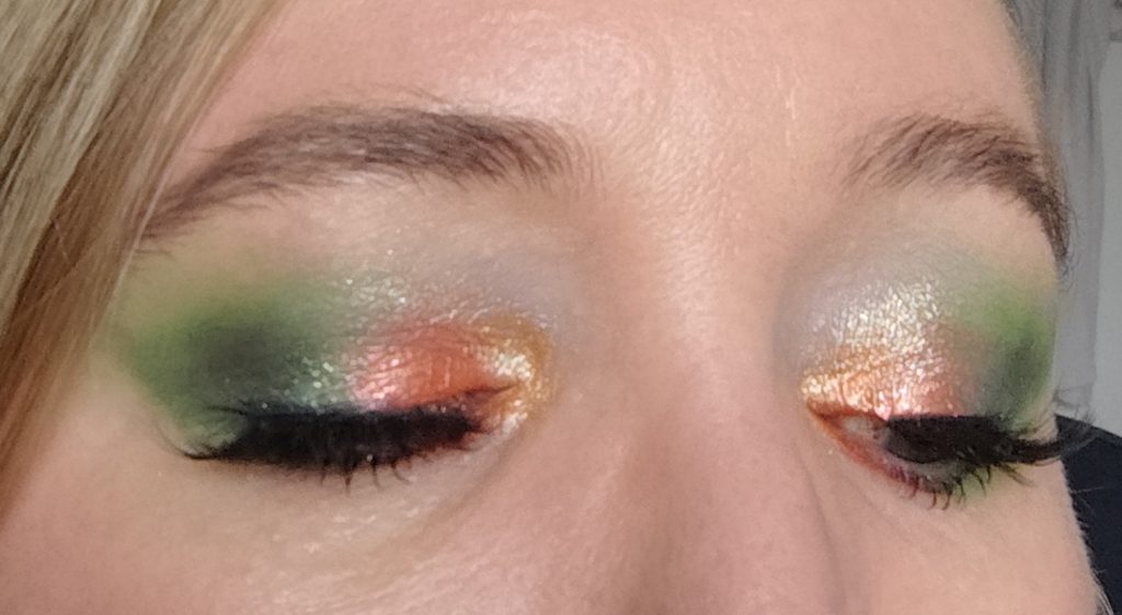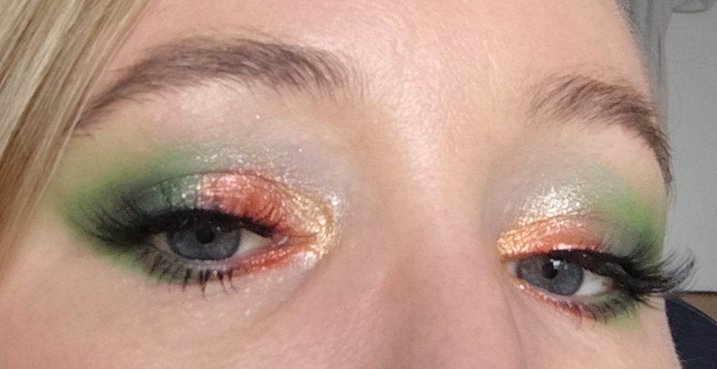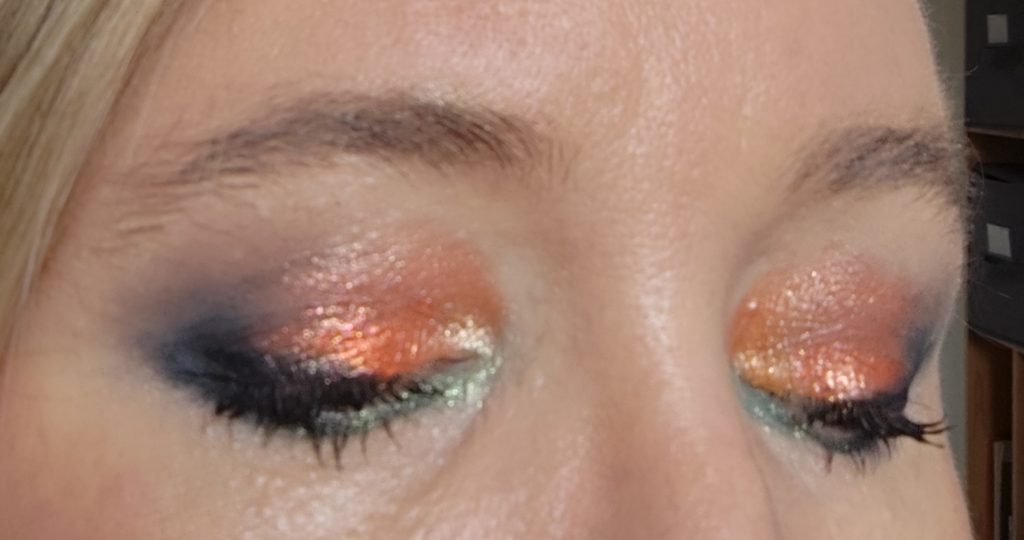 Danach habe ich das wunderschöne, schimmernde Orange Harvest Moon benutzt und auf dem gesamten beweglichen Lid aufgetragen. Am inneren Augenwinkel und dem 1/3 des beweglichen Lids habe ich das hellere, schimmernde Orange Witching Hour benutzt.
