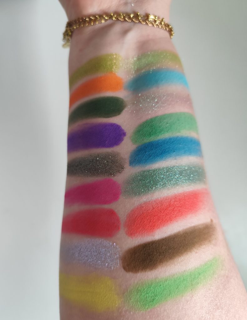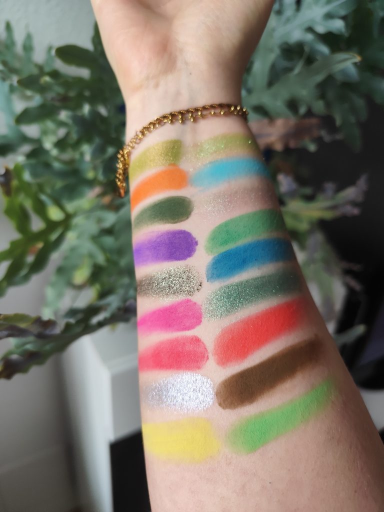 Mir gibt die Palette Faschings- bzw. Karneval-Vibes. Ich hab jetzt das gelb und das grün auf dem Swatch ganz unten verwendet.