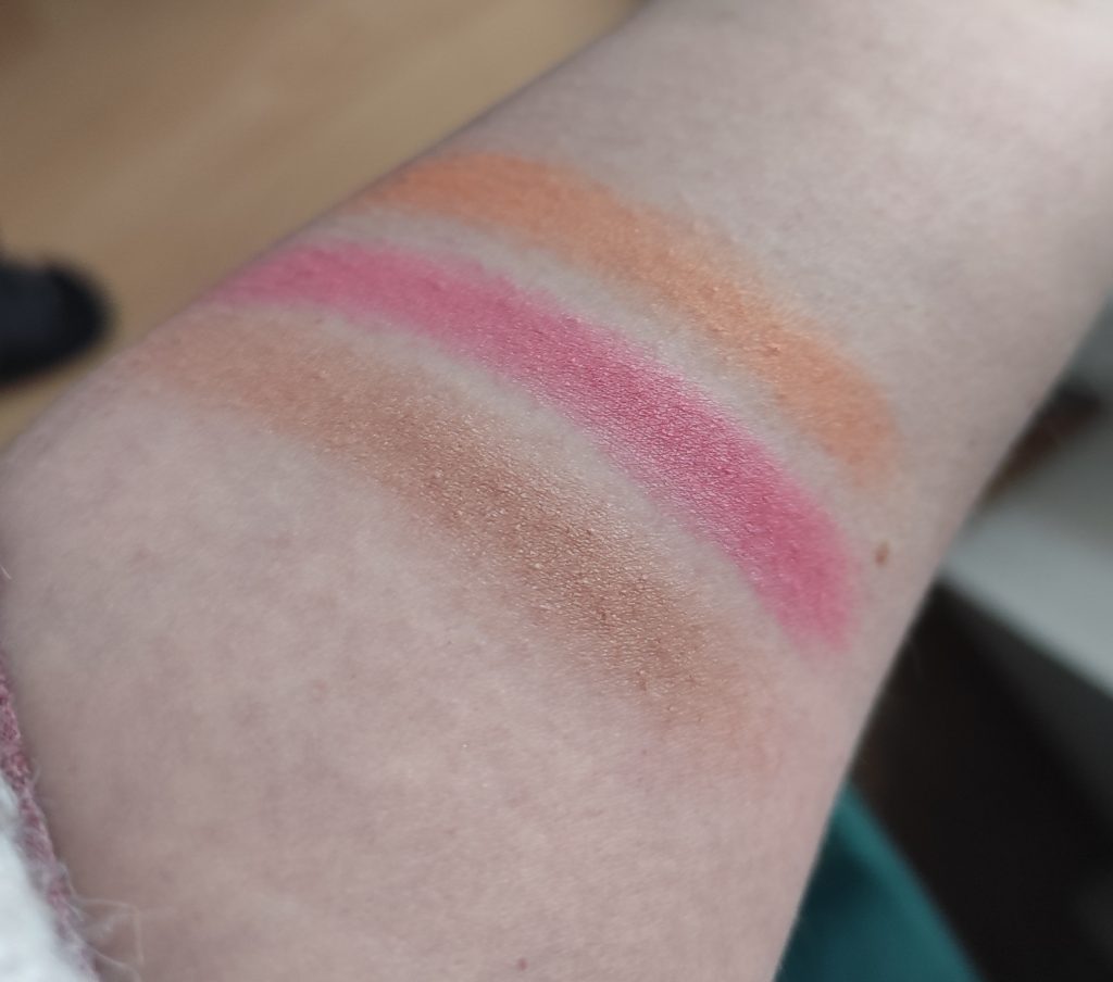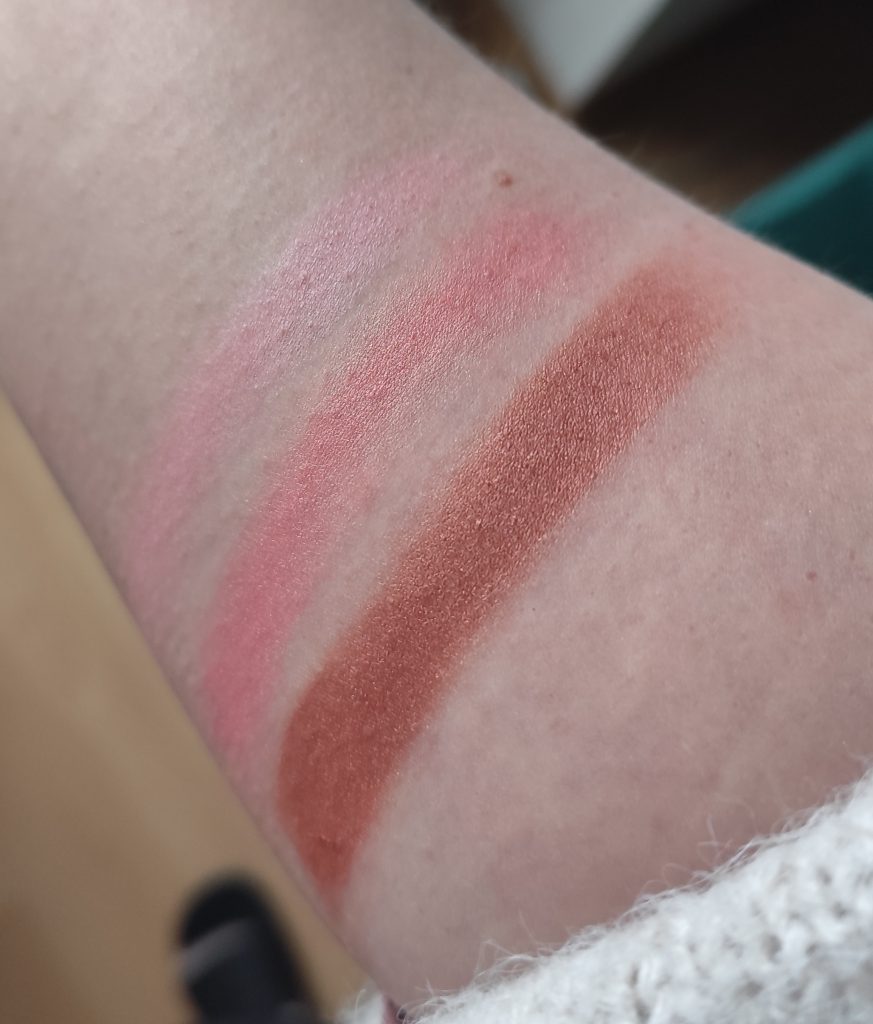 Die Swatches gefallen mir echt gut. Dabei ist ein schönes oranges Blush, ein dunkler Rosa-Ton der einen leichten Einschlag ins korallige hat und ein kühlstichiger Bronzer. Alles hat einen leichten Schimmer.