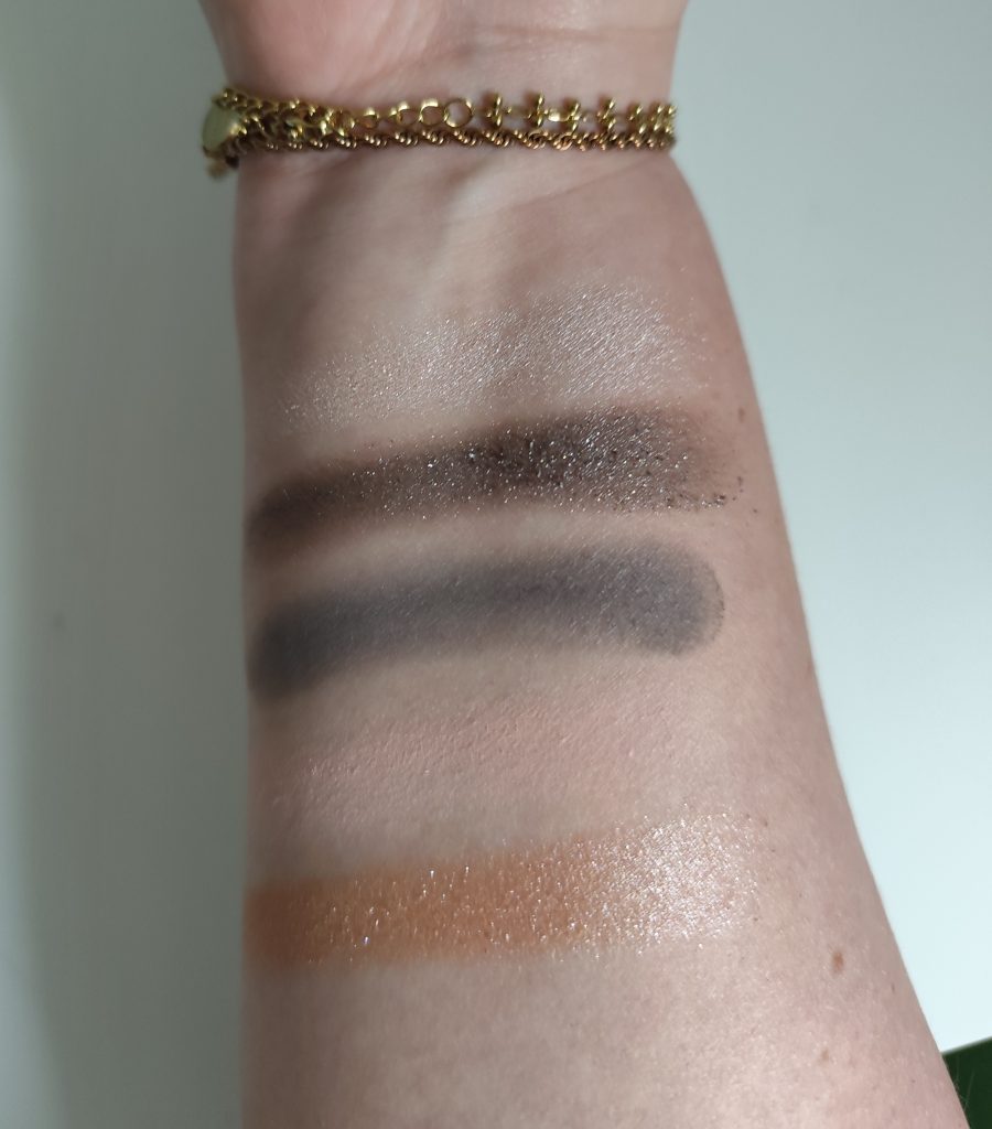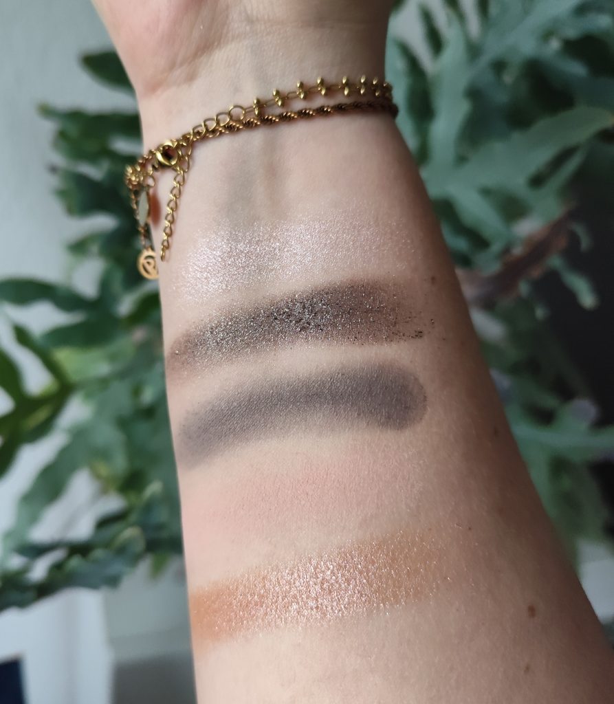 Hier die Swatches.. die Schimmertöne sind ganz leicht flakey, besonders das Graubraun, aber mich stört das nicht. Das matte Grau könnte ein bisschen stärker auf der Brust sein, aber insgesamt kann man für den Preis nicht meckern. Ich bin zufrieden. Alles was ich gesagt habe könnte als Kritik aufgefasst werden, aber ich bin wirklich zufrieden.