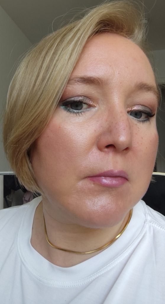 Das Braun habe ich mit dem Finger aufs bewegliche Lid gegeben und in den Innenwinkel den rosa Schimmer/Glitzer neben dem Terra Cotta.