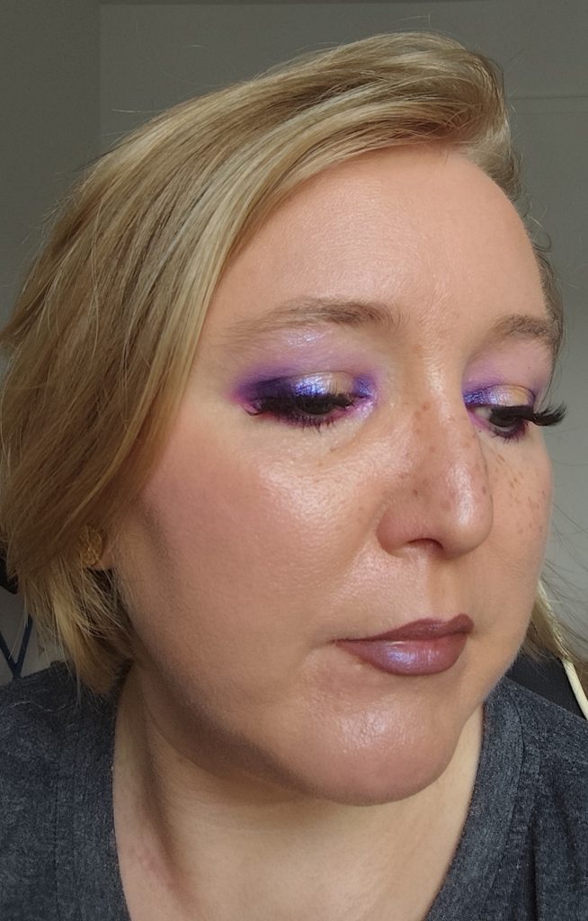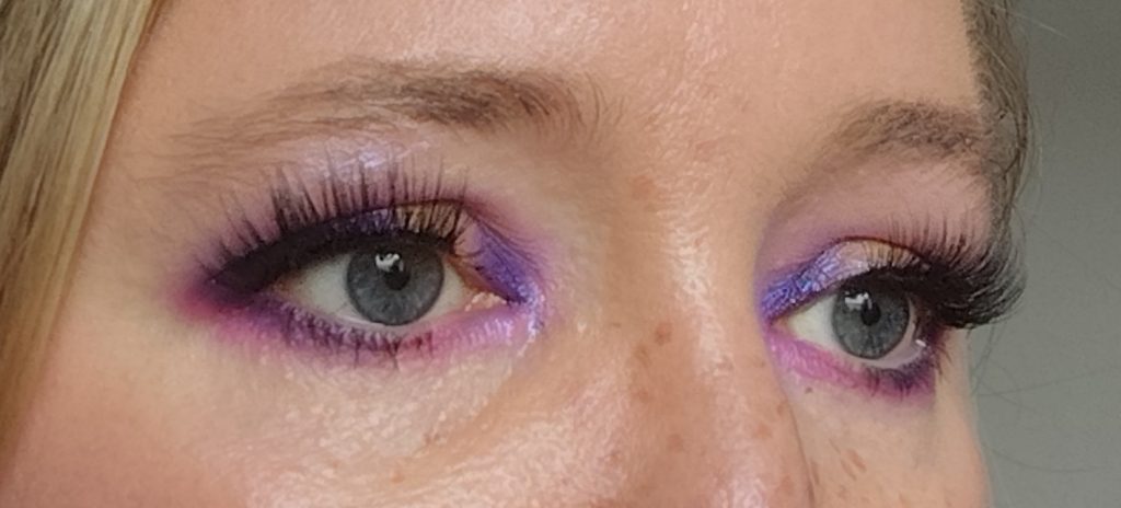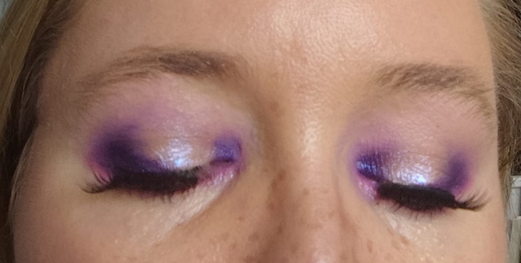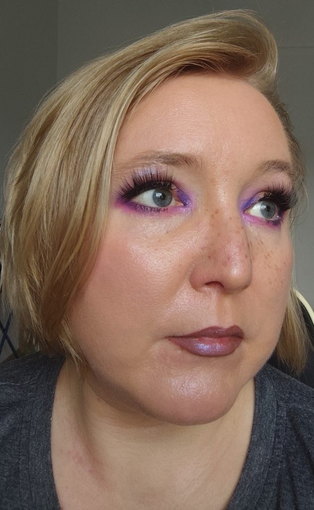 Ich habe das matte, dunkle Lila Charms innen und außen auf dem beweglichen Lid aufgetragen. Auch unter dem Auge habe ich es außen aufgetragen. Danach habe ich das matte, helle Rosa Marshmallow genommen und damit das Lila nach oben hin zur Braue ausgeblendet.