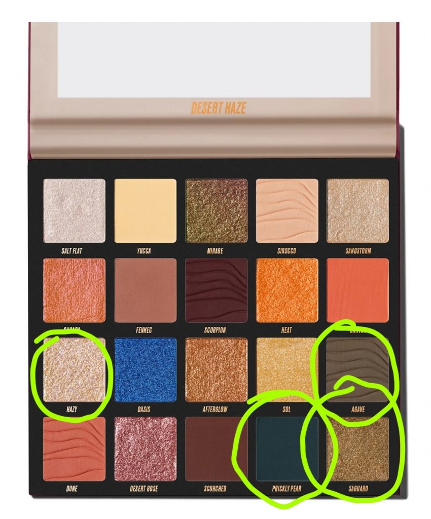 Ich habe zuerst innen und außen am beweglichen Lid Prickly Pearl aufgetragen. Ich habe dabei eine Wing-Form geschminkt, mit der Farbe bin ich auch unter dem Auge lang gegangen bis ca. zur Hälfte. Danach habe ich die Farbe mit Agave ausgeblendet. Dazu habe ich einen Blendepinsel genommen, bin leicht in Agave gegangen und hab den Übergang ganz leicht mit kleinen Kreisen/Flicks verblendet. Danach habe ich das schimmernde Grün Saguard am beweglichen Lid neben und auf Prickly Pear aufgetragen. In der Mitte des Lids habe ich nach oben hin einen Streifen frei gelassen. Auf den Streifen kam dann Hazy. Hazy habe ich auch über Prickly Pearl als Highlight am Innenwinkel aufgetragen. Außerdem auch unter der Braue und unter dem Auge in der vorderen Hälfte.
