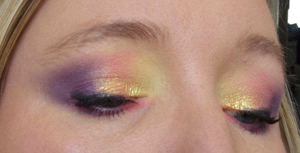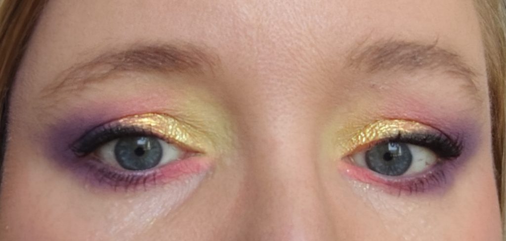 Dann kamen die Schimmertöne.. das Orange habe ich auf die äußere Hälfte des beweglichen Lids aufgetragen, das gelb auf die innere Hälfte. Danach habe ich das dunkle, schimmernde Lila noch ganz am äußeren beweglichen Lid aufgetragen und mit dem matten Lila verblendet.