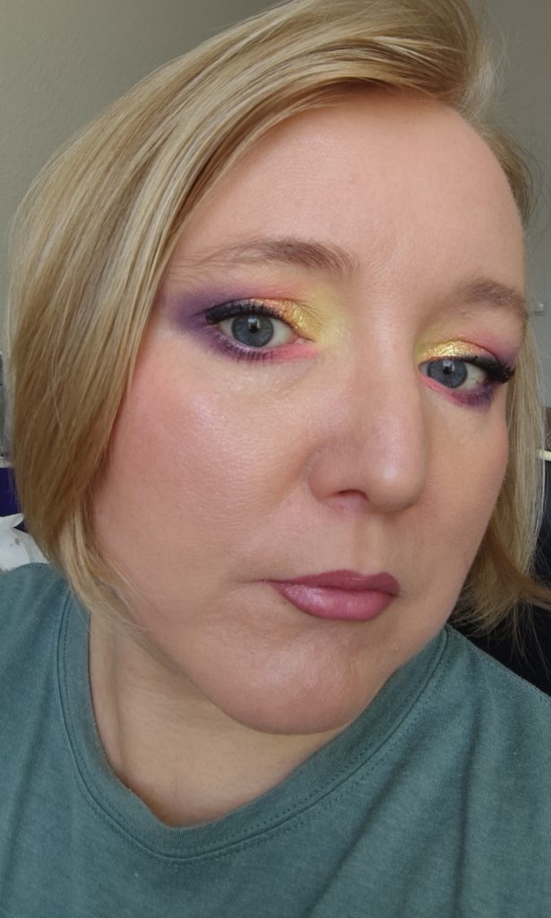 Zuerst habe ich das matte gelb in der oberen Reihe auf und über dem Innenwinkel mit einem fluffigen Pinsel verteilt. Danach habe ich am äußeren Augenwinkel und darüber das matte Lila aus der äußeren Reihe aufgetragen, bis sich das gelb und das Lila fast berührt haben. Am unteren Augenkranz habe ich ebenfalls das Lila aufgetragen. Danach habe ich an der inneren Hälfte des unteren Wimpernkranzes den Lachston aus der oberen Reihe aufgetragen und ins Lila verblendet. Über dem beweglichen Lid habe ich den Lachston zwischen das gelb und das Lila geblendet und auch aufs bewegliche Lid aufgetragen.