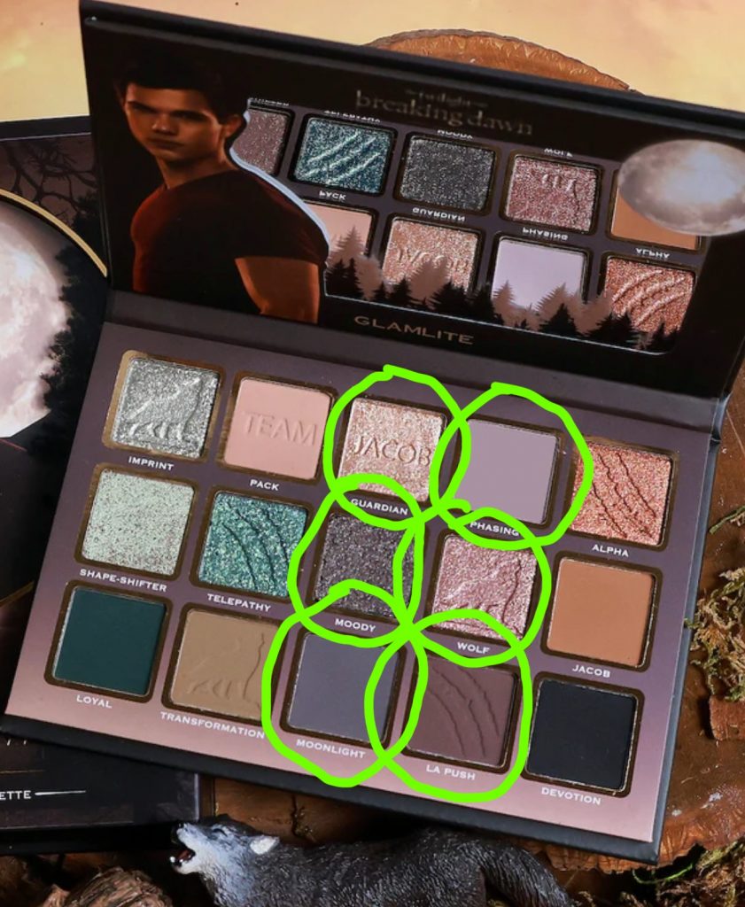 Was mir an der Palette auch nicht so gefällt ist, dass sie außen ein Flipflop-Bild von Jacob und einem Wolf hat. Ich finde es eigentlich nicht unbedingt so cool, Taylor Lautner auf meiner Palette zu sehen.