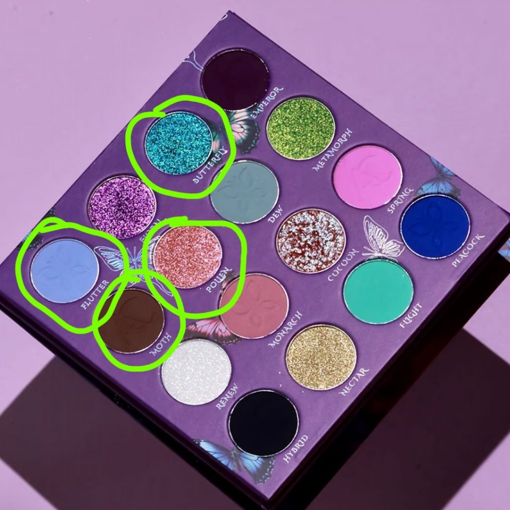 Für den Look habe ich dieses Mal nur vier Shades benutzt. Ich habe Flutter auf dem Innenwinkel aufgetragen und bis ca. Zur Mitte des Auges aufgetragen und nach oben hin ausgeblendet. Auch unter dem Auge habe ich ihn auf die innere Hälfte aufgetragen. Auf der äußeren Hälfte des Auges habe ich Moth aufgetragen.