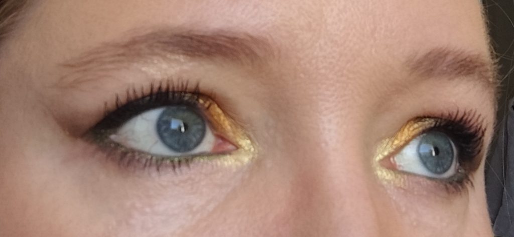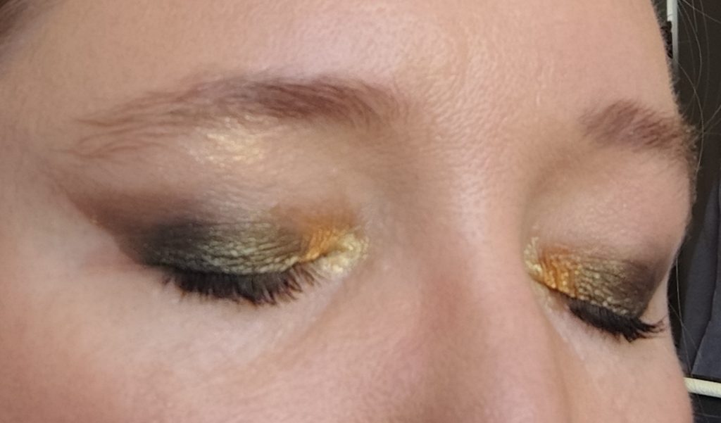 Zuerst habe ich mit dem matten Dunkelbraun einen Wing geschminkt und ihn nach innen ausgesoftet. Dann habe ich den grünbraunen Schimmer Soulless Monster aufs Lid aufgetragen, aber nicht bis ganz vorne. Weiter vorne kam dann das schimmernde Gelborange. Als Highlight am Innenwinkel habe ich dann Mood Control verwendet. Das habe ich auch unter der Braue als Highlight verwendet.