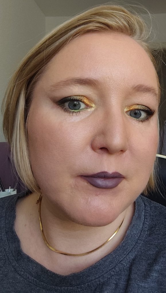 Danach habe ich einen grünen Multichrome-Eyeliner von Colour Pop auf die untere Wasserlinie gegeben und die Wimpern getuscht.
