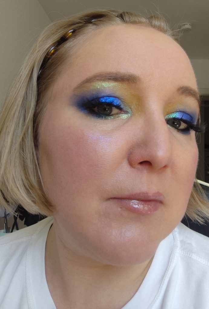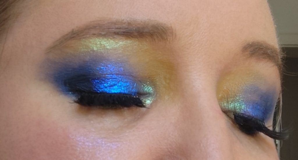 Das matte Blau habe ich auch auf dem gesamten Augenlid verwendet, da das schimmernde Blau eher ein Topper-Ton ist und nicht 100% deckt. Das habe ich dann über das komplette Augenlid gegeben. Oberhalb vom Innenwinkel habe ich das matte Gelb verwendet. Als Highlight vom Innenwinkel und unter der Augenbraue habe ich das Duochrome Orange verwendet, dass auch blau schimmert. Den Ton habe ich auch auf der inneren Hälfte vom unteren Wimpernkranz benutzt.