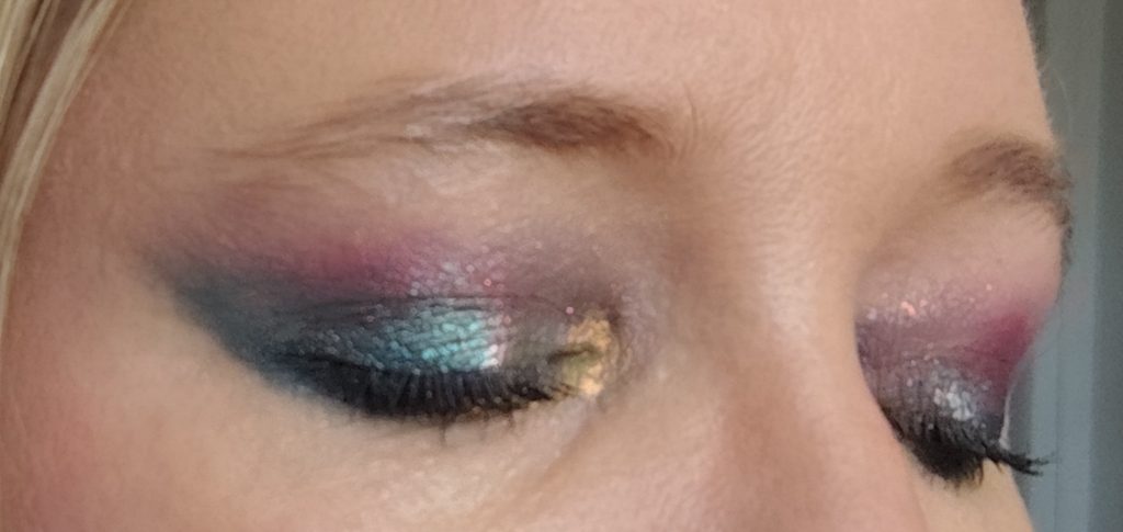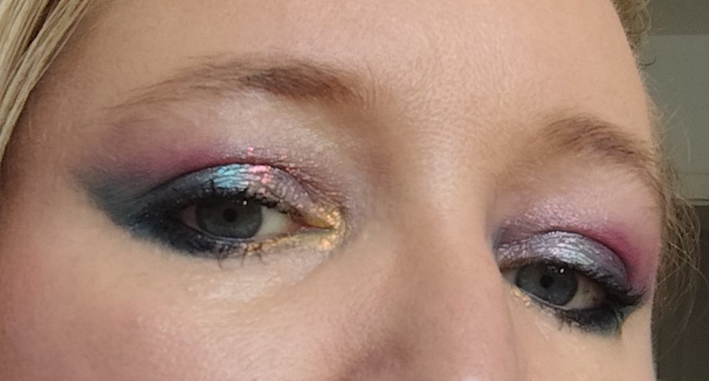 Dann ging es zu den Schimmertönen.. auf der äußeren Hälfte des beweglichen Lids habe ich den blauen Multichrome benutzt, der zu Lila shiftet. Beim inneren beweglichen Lid habe ich den dunkelroten Schimmer verwendet, der zu Grün und Gelb shiftet.