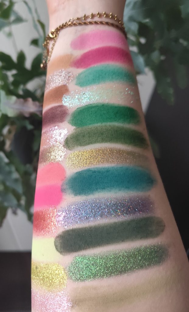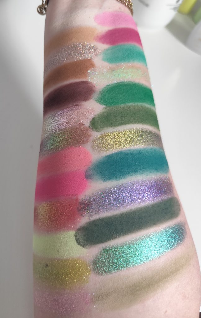 Einige Schimmer sehen flakey aus, aber auf dem Auge wird das ganze dann zu feinem Schimmer. Die Schimmertöne sind auch butterweich.. da sind wenn ihr die Palette bekommt weiße Abdeckplättchen drauf, sonst würden die wahrscheinlich beim Transport schon in 1000 Teile zerbröseln. Bei mir ist auf jeden Fall alles sicher angekommen.