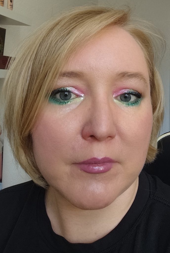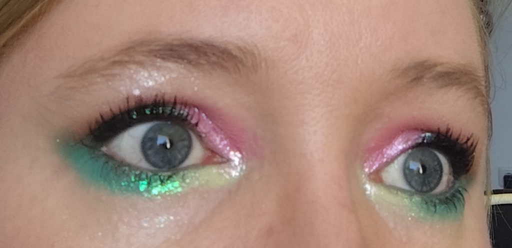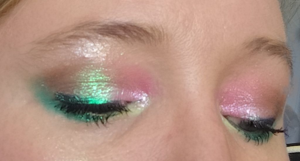 Grob habe ich die matten braunen Shades im hinteren Teil des beweglichen Lids verwendet, im vorderen das matte Rosa. Das Rosa habe ich mit dem Schimmer getoppt. Auf der äußeren Hälfte das schimmernde grün. Das ist ein ziemlich guter Topper-Ton. Und man braucht wirklich nur 2-3 von den Schimmerflöckchen und alles glitzert um die Wette.