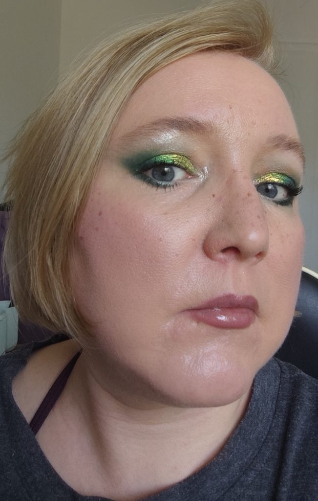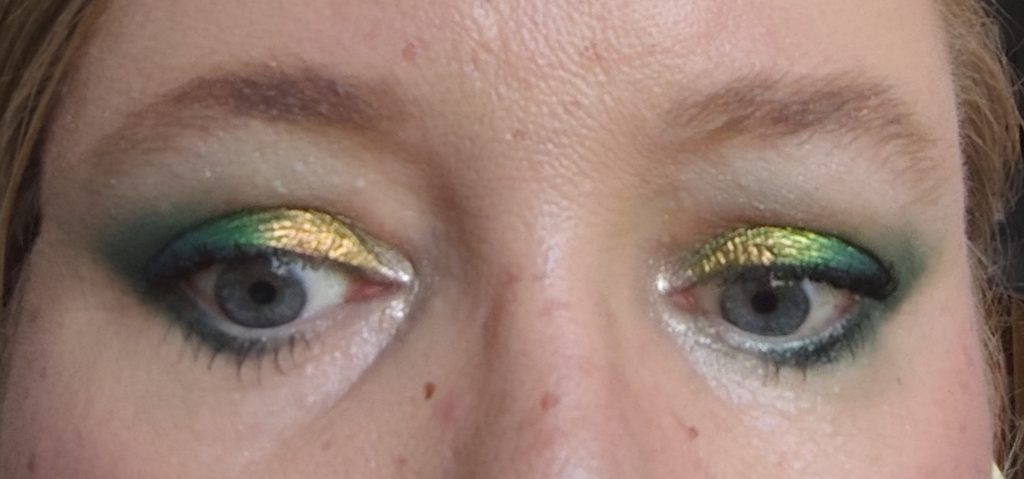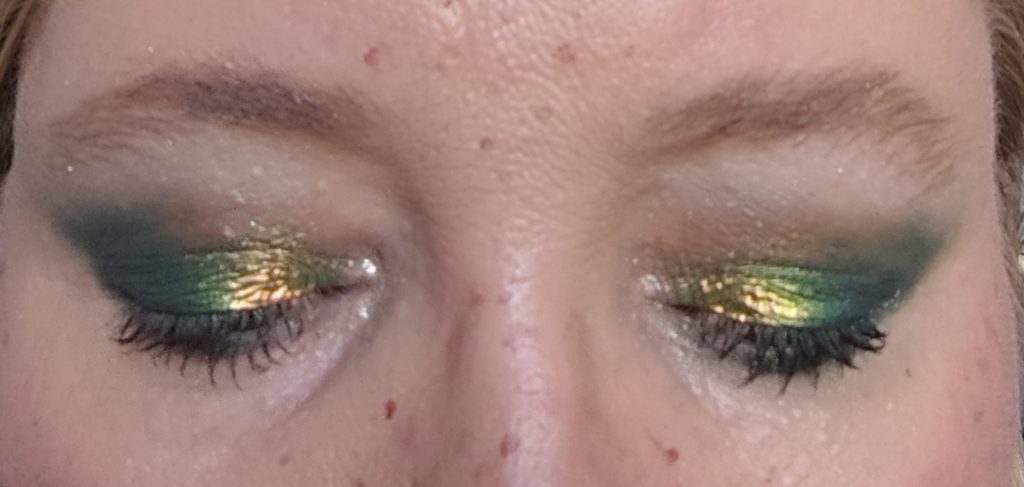 Die matten, dunklen Grüntöne habe ich im äußeren Augenwinkel verwendet, hier habe ich zuerst die Wing-Form gezogen und nach innen mit dem matten Braun ausgeblendet. Danach habe ich auf der äußeren Hälfte des beweglichen Lids den grünen Schimmer mit leichtem Blaushift aufgetragen und danach innen den grünen Schimmer der nach gelb/orange shiftet.