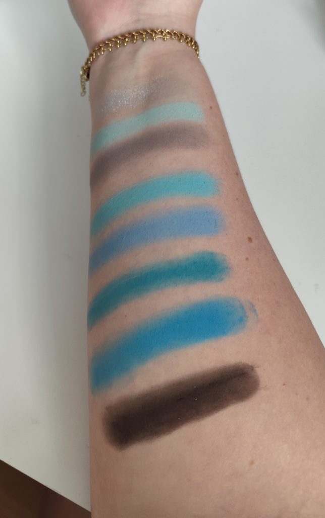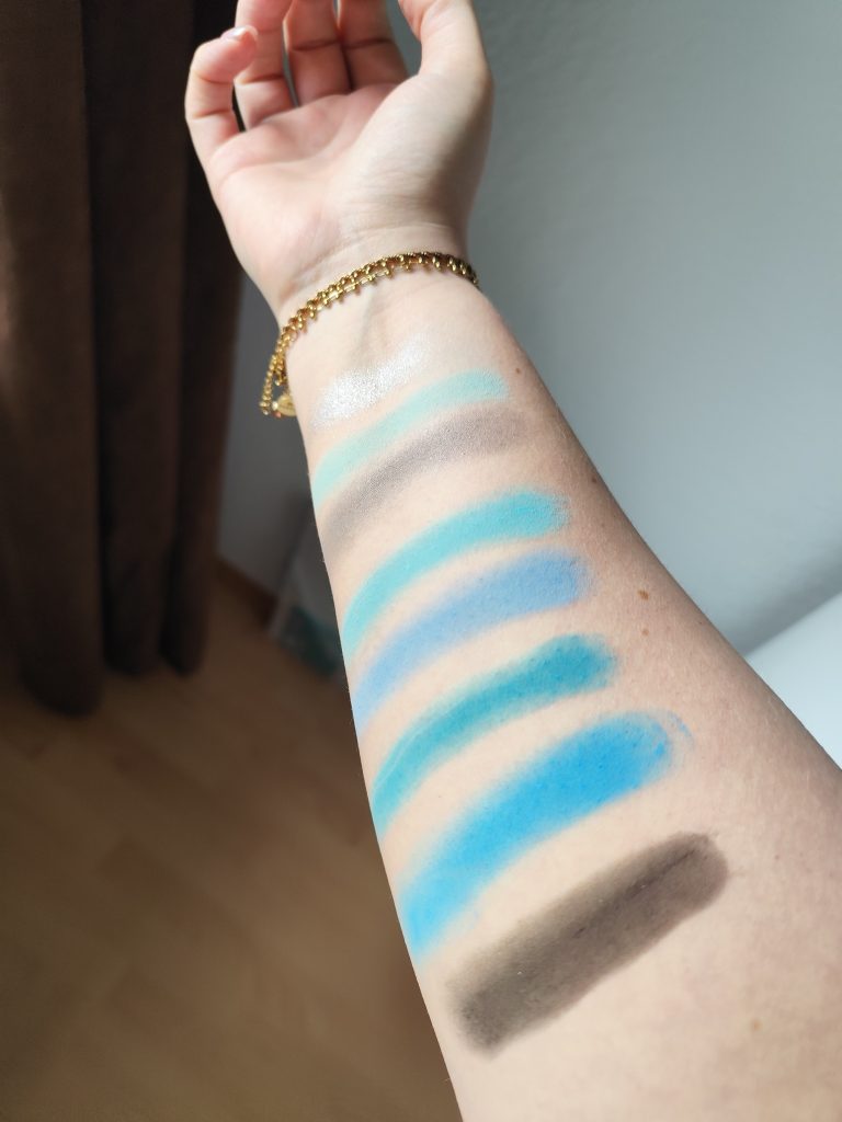 Es sind 5 Matte Blautöne enthalten, ein so called schwarz, ein metallischer Grauton und ein glitzerndes Silber.