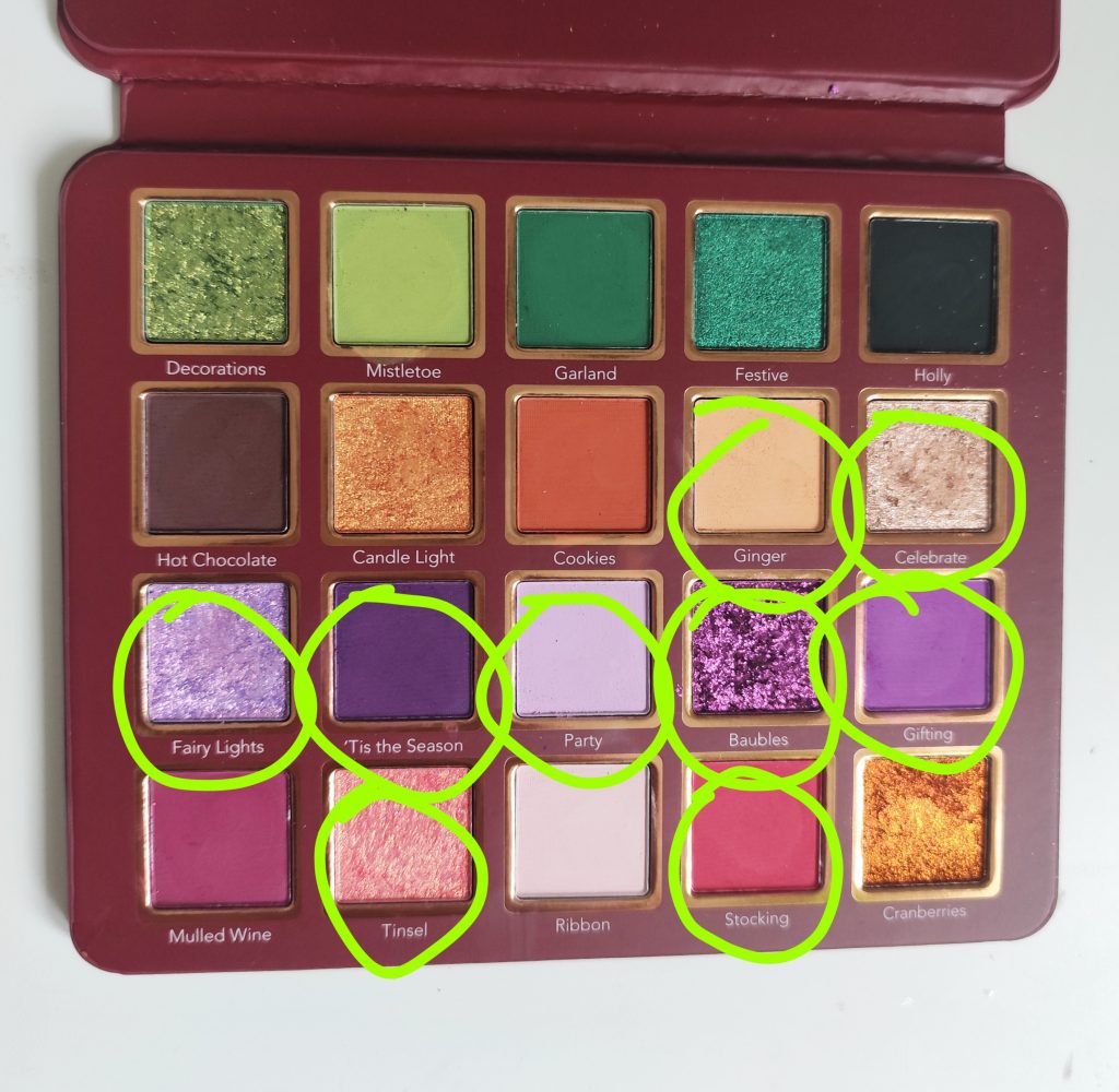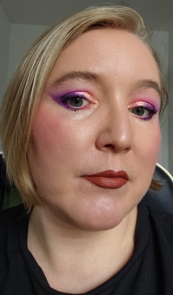 Ich habe mit dem mittleren, matten Lila einen Wing geschminkt. Mit Party habe ich ihn ausgeblendet und mit tis the season verdunkelt. Stocking habe ich als übergang vom Lila zu dem Ton Ginger benutzt. Auch die habe ich mir Party ausgeblendet.
