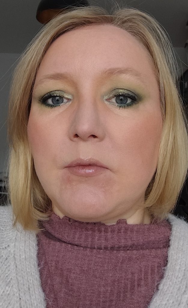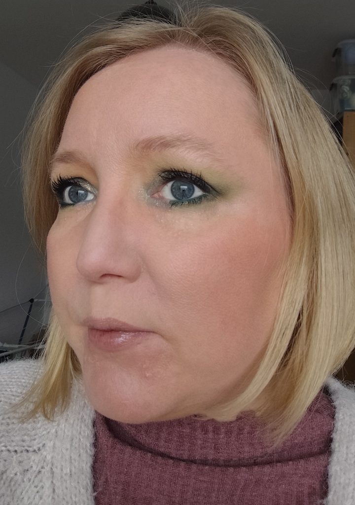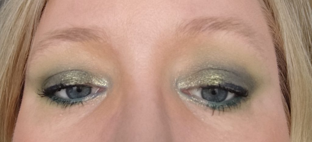 Für den Look habe ich mir die Grüntöne aus der zweiten Reihe ausgesucht sowie für den Innenwinkel den fast Duochromen Schimmer aus der vierten Reihe.