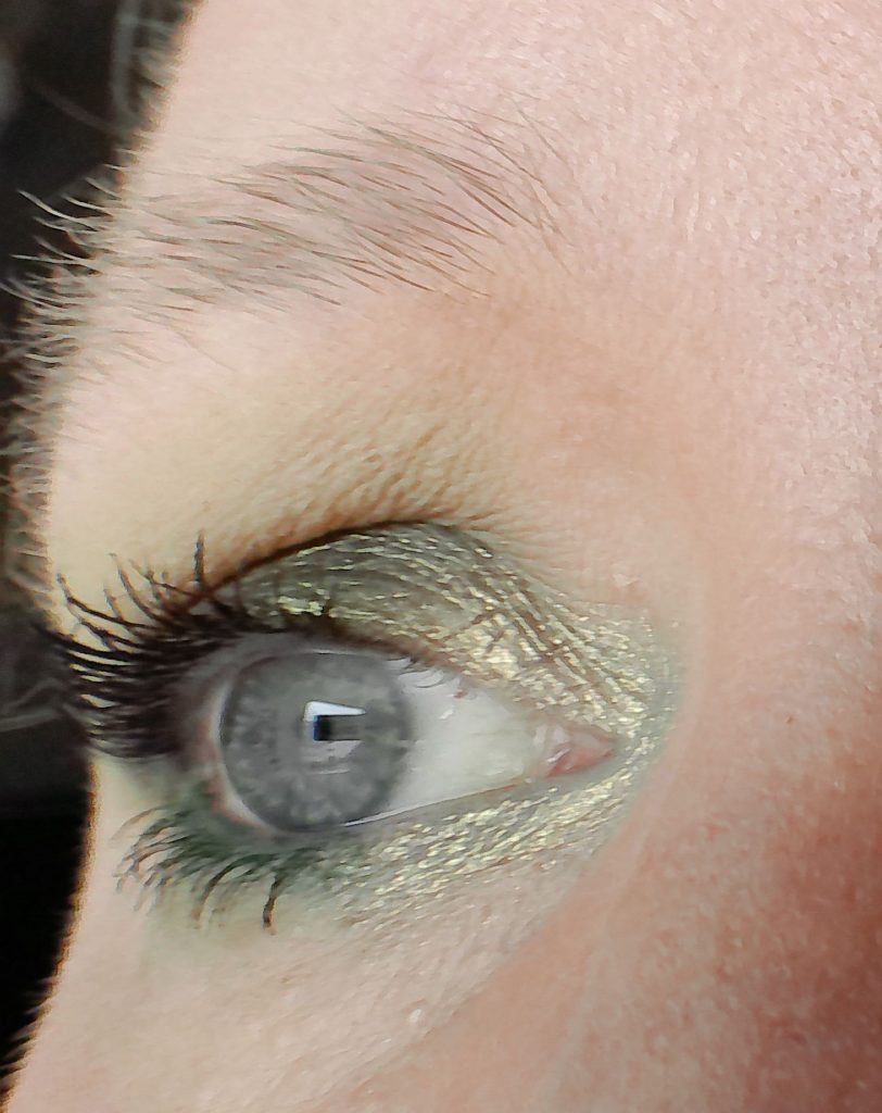 Den hellen, matten Grünton habe ich auf den äußeren Augenwinkel und über dem beweglichen Augenlid aufgetragen und ausgeblendet. Mit dem dunkleren Ton darunter habe ich den äußeren Augenwinkel verdunkelt. Auf dem beweglichen Lid habe ich dann den grünen Schimmerton genommen und als Highlight am Innenwinkel den bläuliche/goldenen Schimmerton am Innenwinkel.