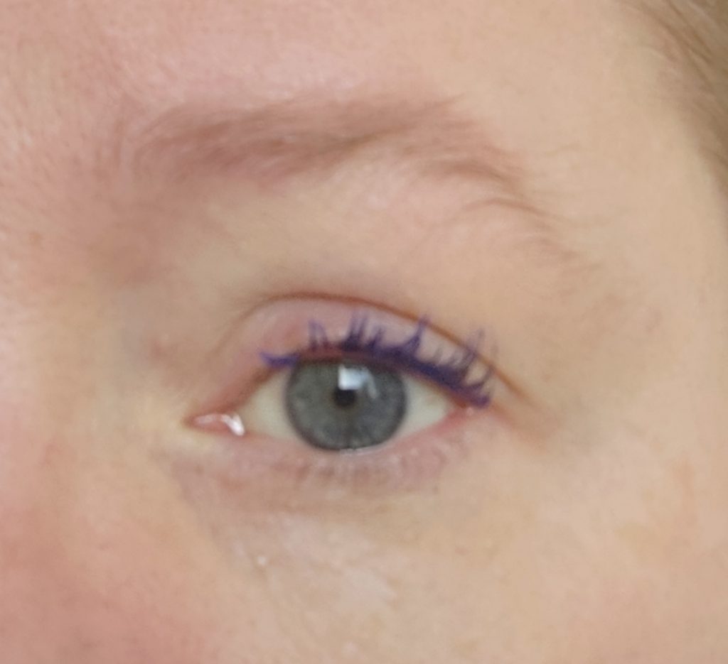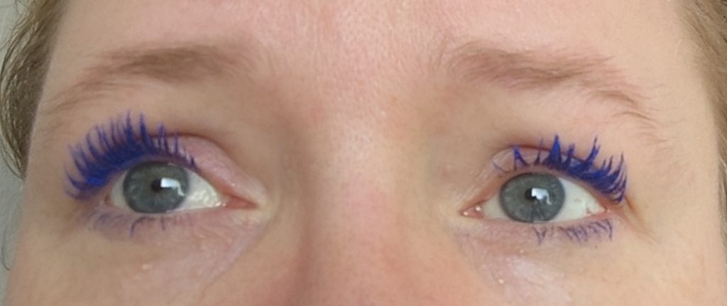 Das sind meine Wimpern nach einer Schicht. Man sieht das Blau ein bisschen, aber die Wimpern werden nicht alle komplett blau, so wie es meinem Ideal entsprechen würde. Die Mascara macht einen ganz guten Schwung, das Ergebnis ist von der blauen Farbe abgesehen recht natürlich.