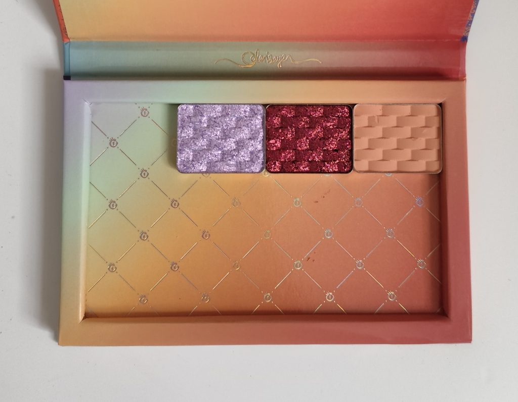 Ich hatte drei Single Shadows in dem Bundle, ein beiger Matter Ton, den man immer gut zum verblenden nutzen kann, einen hellen Lila-Ton sowie ein dunkles Rot. Ich glaube, die könnten sogar Duo/Multichromes sein.